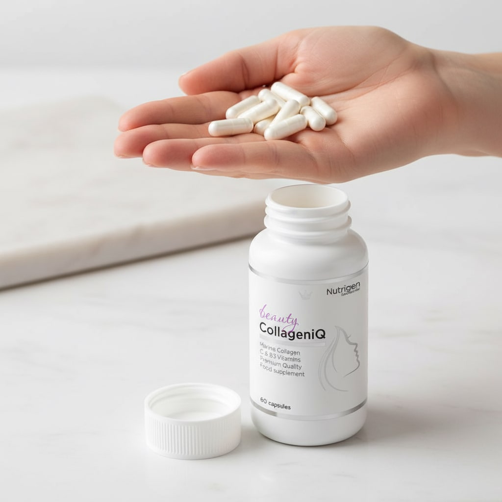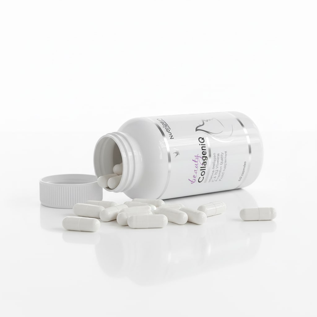 Verjüngen Sie Ihre Haut von innen heraus mit CollageniQ – ein Premium-Beauty-Supplement, das speziell entwickelt wurde, um den Zeichen der Hautalterung entgegenzuwirken. Formuliert mit 100 % reinem Naturkollagen, liefern diese Tabletten die essenziellen Bausteine, die Ihr Körper benötigt, um einen jugendlichen, strahlenden Teint zu bewahren. Da die natürliche Kollagenproduktion mit zunehmendem Alter abnimmt, was zur Bildung feiner Linien und zum Verlust der Spannkraft führt, arbeitet CollageniQ daran, dieses Depot wieder aufzufüllen und die Hautoberfläche effektiv zu glätten.